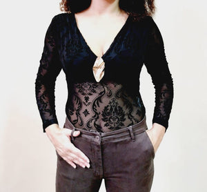 MAGLIA BODY CON RICAMI CHE TRASPARE IN ALCUNI PUNTI,SCOLLO A V CON DETTAGLIO ORO,TAGLIA UNICA,VESTE UNA S/M.
